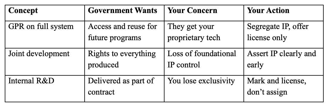 When you show up to a DoD contract with your own capability—something that’s been privately developed—you’re risking dilution of your IP position if you don’t assert rights clearly and early. This isn’t just about legal posture. If you let GPR or Unlimited Rights bleed into your core tech, you’re giving competitors a leg up—sometimes with your own material. And you’ll have no recourse because you didn’t draw the line up front.